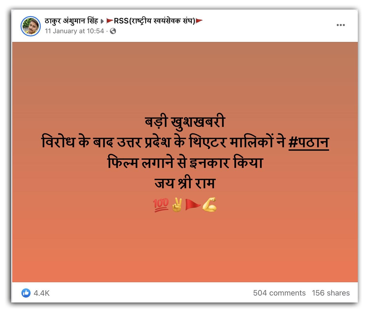मिसाल के तौर पर, एक फेसबुक यूजर ने लिखा, "बड़ी खुशखबरी विरोध के बाद उत्तर प्रदेश के थिएटर मालिकों ने #पठान फिल्म लगाने से इनकार किया जय श्री राम".