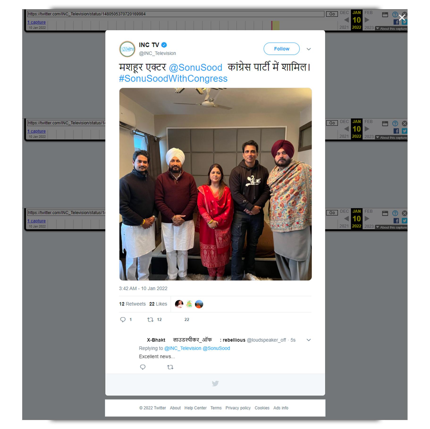 लेकिन आर्काइविंग वेबसाइट वेबैक मशीन में हमें ‘@INC_Television’ के ट्विटर हैंडल से किया गया वो ट्वीट मिल गया जिसमें सोनू सूद के कांग्रेस पार्टी में शामिल होने की बात लिखी है.