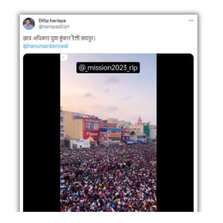 राजस्थान की राजधानी जयपुर में 14 सितंबर को राष्ट्रीय लोकतांत्रिक पार्टी के नेता हनुमान बेनीवाल ने महारैली का आयोजन किया. पार्टी के लोगों का कहना है कि इस महारैली में एक लाख से अधिक युवा शामिल हुए. बेनीवाल के नेतृत्व में ‘राष्ट्रीय लोकतान्त्रिक पार्टी’ (आरएलपी) ने राजस्थान में छात्र संघ चुनाव बहाल करवाने की मांग को लेकर इस ‘छात्र अधिकार युवा हुंकार महारैली’ का आयोजन किया था. इसी रैली के संदर्भ में अब सोशल मीडिया पर एक वीडियो वायरल हो रहा है.