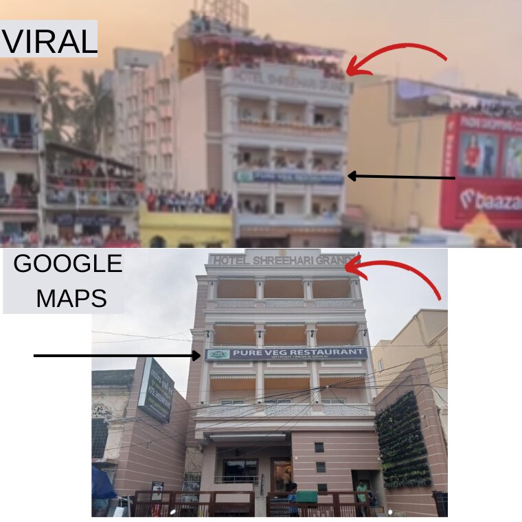 वायरल वीडियो और गूगल मैप्स पर मौजूद इस होटल की तस्वीरों की तुलना करने पर हमने पाया कि दोनों में ऊपर 'होटल श्रीहरी ग्रैन्ड' का साइनबोर्ड लगा है और बीच में एक नीले बोर्ड पर 'प्योर वेज रेस्टोरेंट’ का बोर्ड भी दिखता है. दोनों में इमारत का ढांचा और पेंट का रंग एक जैसा ही है.