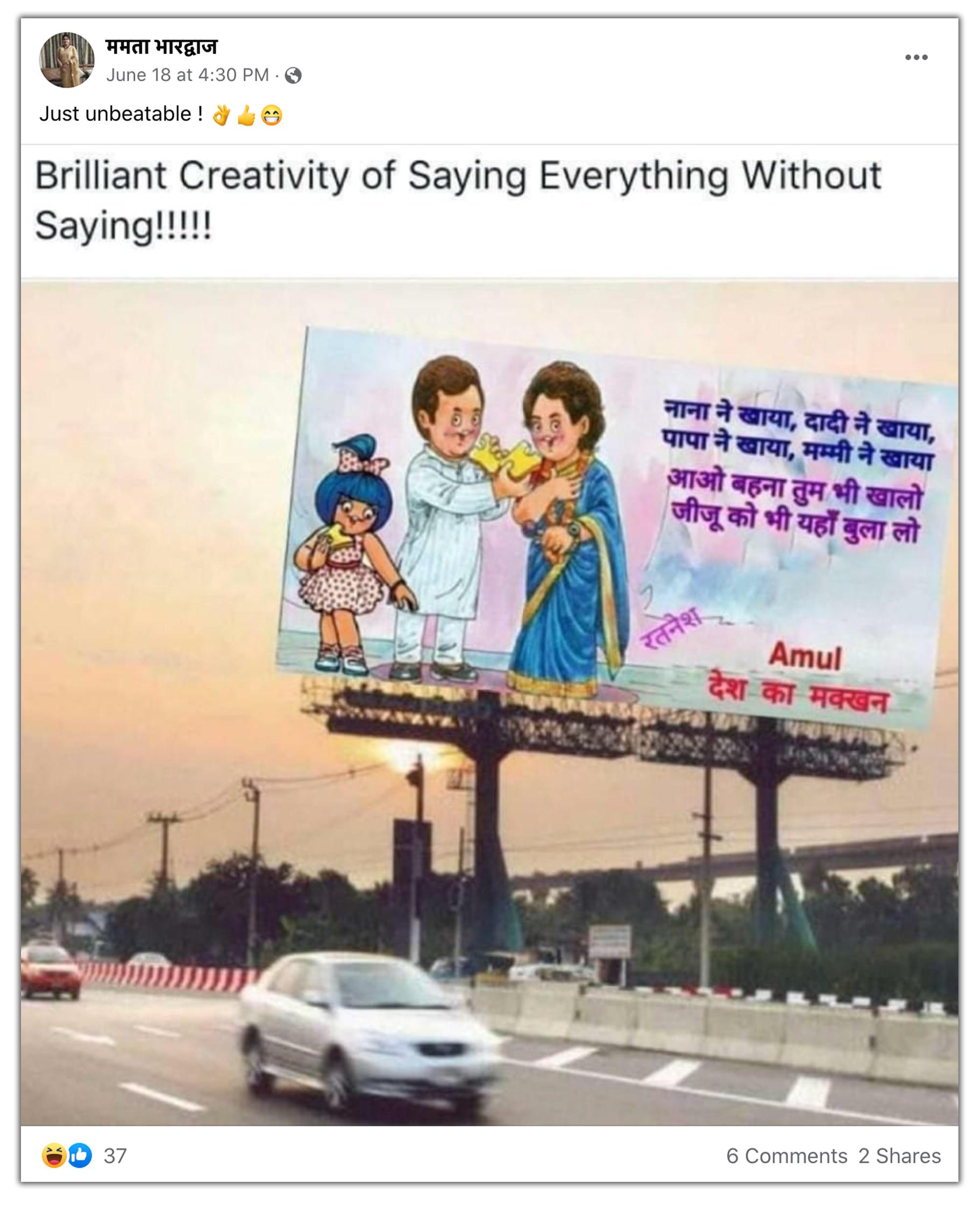 साथ ही लिखा है "फैमिली स्त्री, अमूल भाइयों और बहनों के लिए.” इस विज्ञापन में कहीं भी गांधी परिवार पर तंज कसने वाला स्लोगन नहीं लिखा है