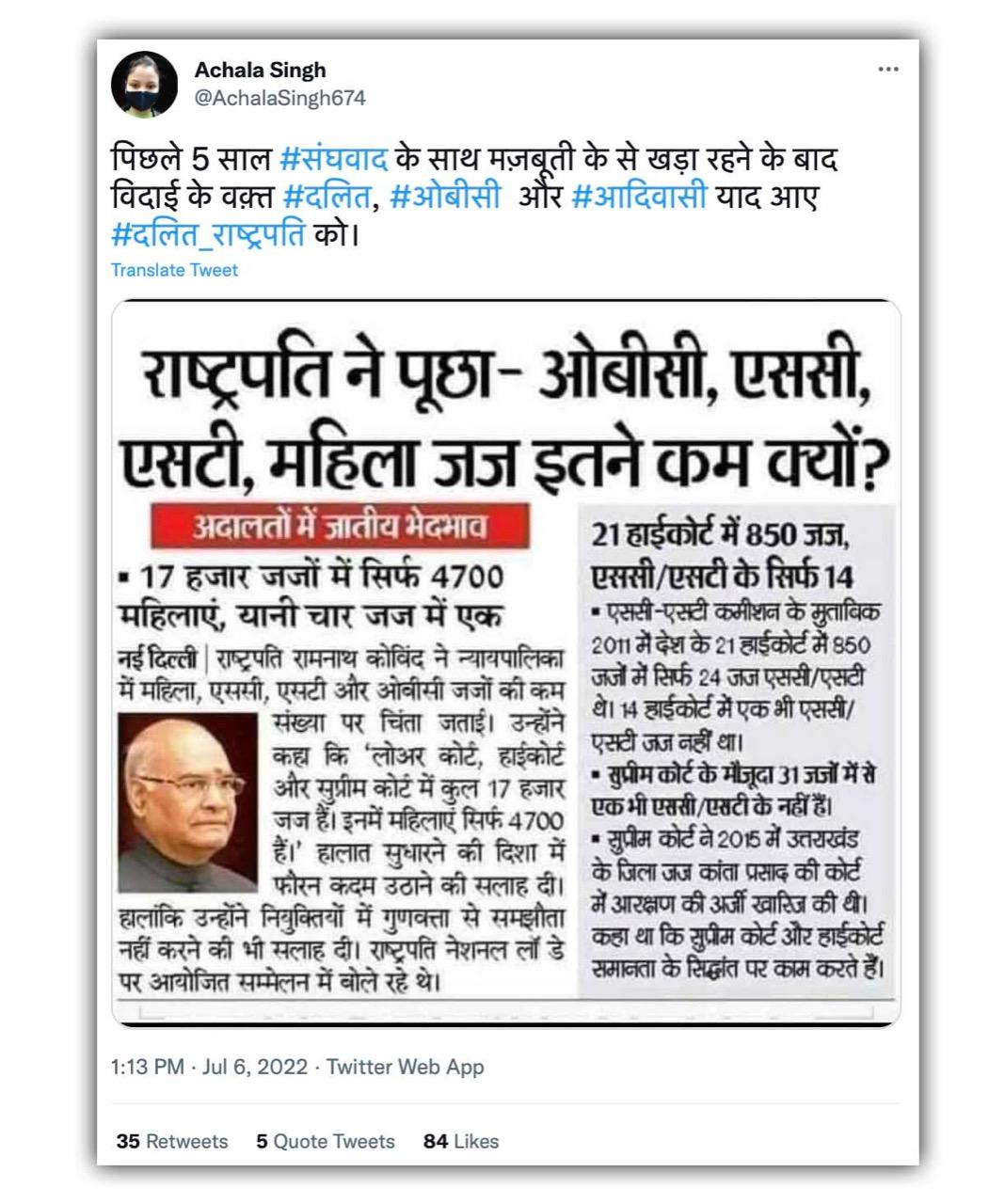 मिसाल के तौर पर एक ट्विटर यूजर ने लिखा, "पिछले 5 साल संघवाद के साथ मज़बूती के से खड़ा रहने के बाद विदाई के वक़्त दलित, ओबीसी और आदिवासी याद आए दलित राष्ट्रपति को.”