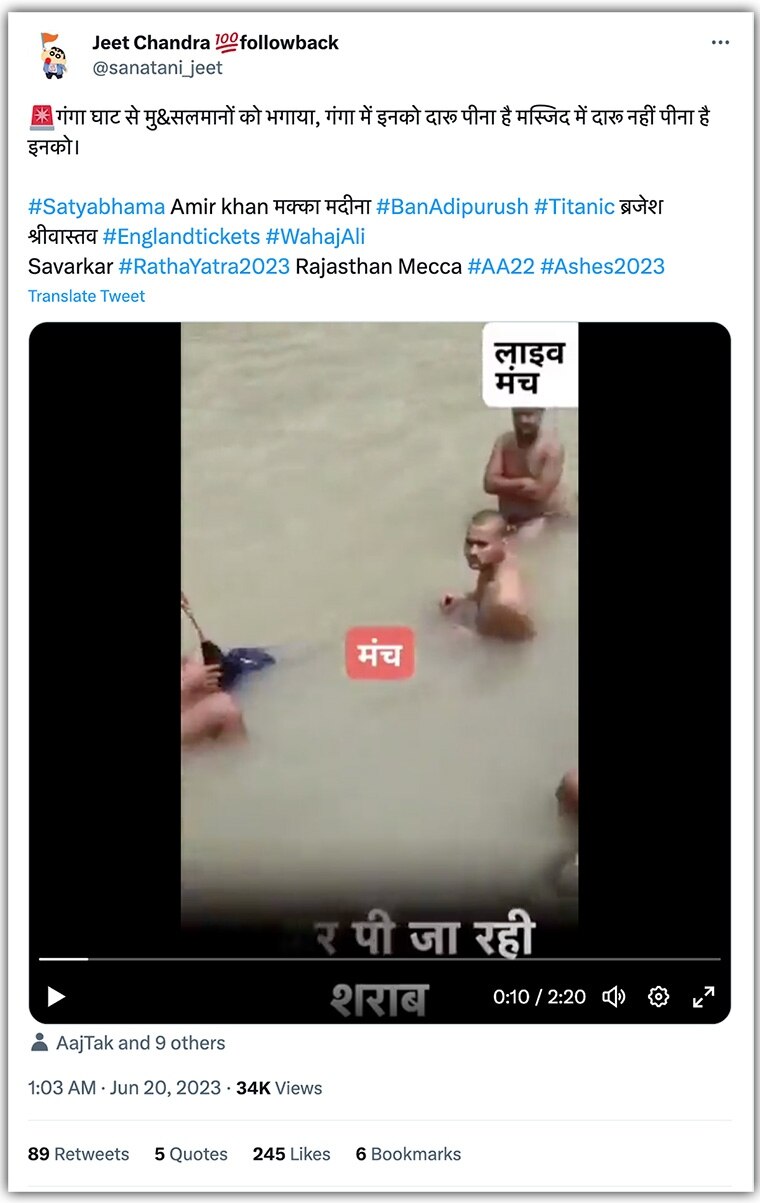 एक ट्विटर यूजर ने इस वीडियो को पोस्ट करते हुए लिखा, "गंगा घाट से मुसलमानों को भगाया, गंगा में इनको दारू पीना है मस्जिद में दारू नहीं पीना है इनको."