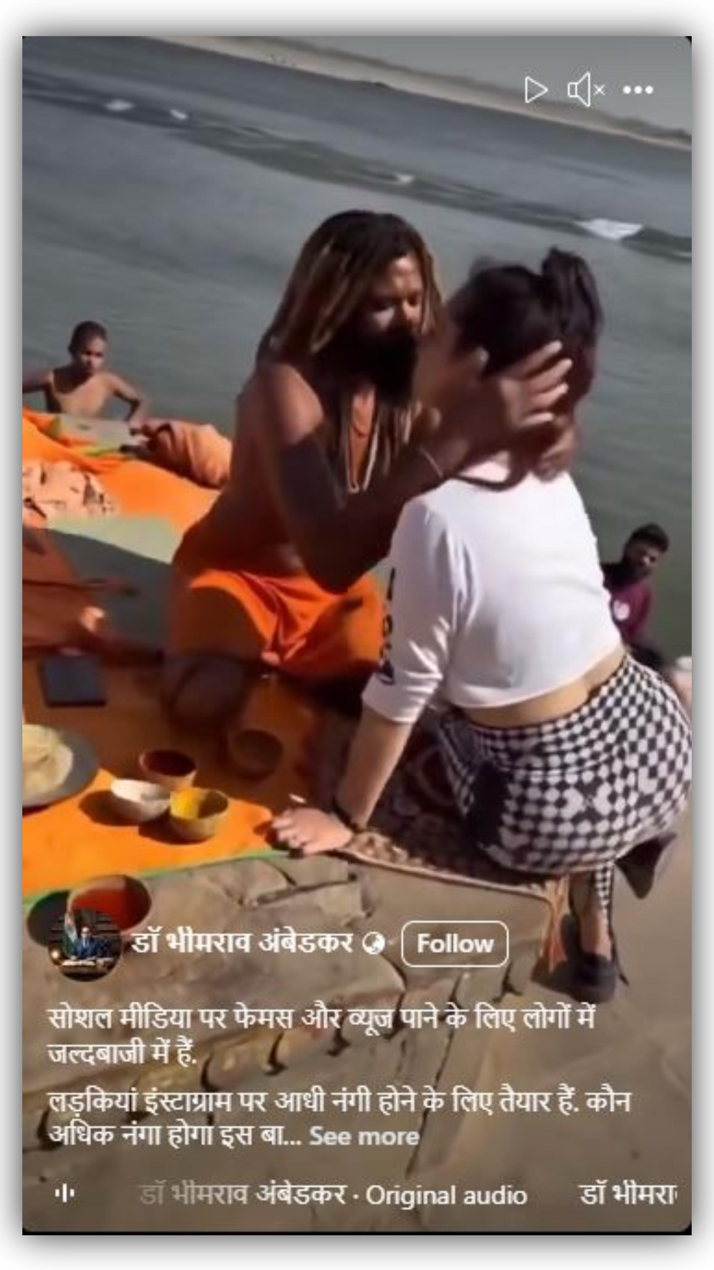 वीडियो को शेयर कर एक फेसबुक यूजर ने लिखा है, “सोशल मीडिया पर फेमस और व्यूज पाने के लिए लोगों में जल्दबाजी में हैं. लड़कियां इंस्टाग्राम पर आधी नंगी होने के लिए तैयार हैं. कौन अधिक नंगा होगा इस बात के लिए एक शो में प्रतियोगिता हो रही है. अश्लीलता में कुछ अनोखा करने के चक्कर में एक विदेशी महिला साधु के साथ किसी घाट पर किस करते हुए वीडियो शूट कर रही है. इस तरह का वीडियो किस बात का सूचक माना जाए. क्या ये Feminism है यां Vulgarism हैं.”