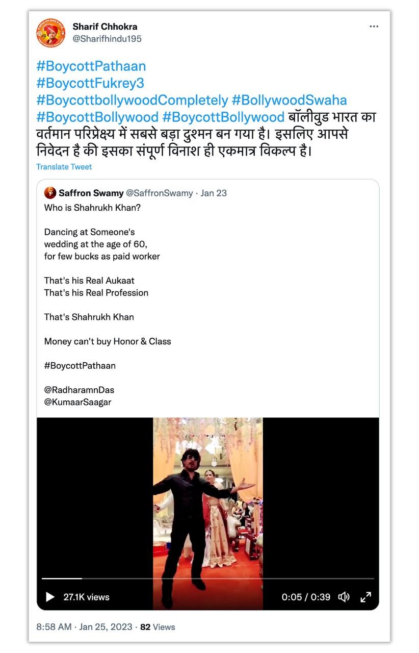 एक ट्विटर यूजर ने इस वीडियो को पोस्ट करते हुए लिखा, "60 साल की उम्र में कुछ पैसों के लिए किसी की शादी में डांस कर रहे हैं. यही शाहरुख खान का धंधा और औकात है. पैसों से इज्जत नहीं खरीदी जा सकती है."