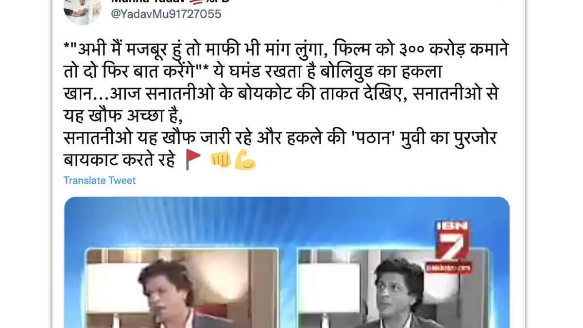 इस वीडियो कोलाज को पोस्ट करते हुए एक ट्विटर यूजर ने लिखा, "अभी मैं मजबूर हूं तो माफी भी मांग लूंगा, फिल्म को 300 करोड़ कमाने तो दो फिर बात करेंगे". ये घमंड रखता है बॉलिवुड का हकला खान... आज सनातनियों के बायकॉट की ताकत देखिए, सनातनीओ से यह खौफ अच्छा है, सनातनियों यह खौफ जारी रहे और हकले की 'पठान' मूवी का पुरजोर बायकॉट करते रहे."