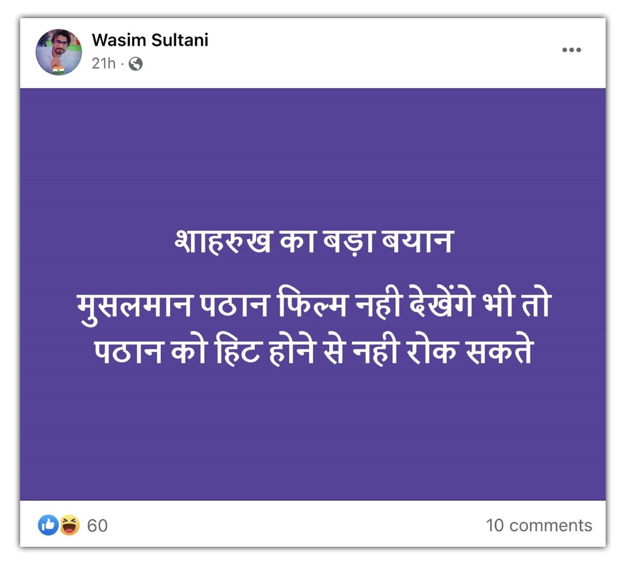 मिसाल के तौर पर, एक फेसबुक यूजर ने लिखा, "शाहरुख का बड़ा बयान मुसलमान पठान फिल्म नही देखेंगे भी तो पठान को हिट होने से नही रोक सकते".