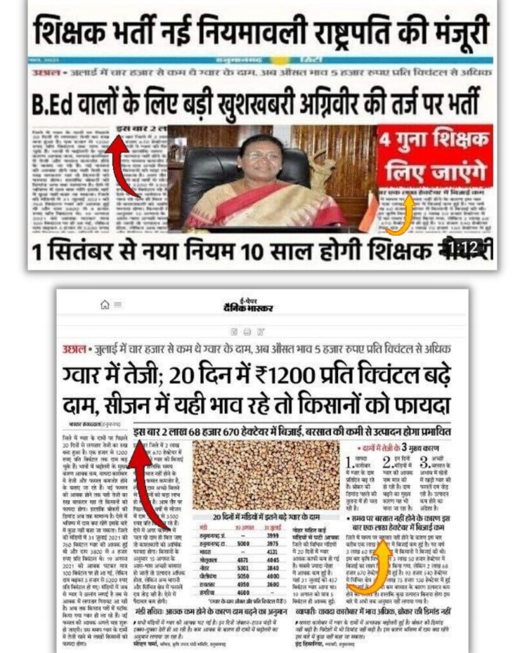 ऐसा कहते हुए एक कथित अखबार की कटिंग शेयर की जा रही है, जिसकी हेडलाइन है, ‘शिक्षक भर्ती नई नियमावली राष्ट्रपति की मंजूरी’. इसके बाद नीचे कई सब हेडलाइंस हैं, जैसे, ‘B.Ed वालों के लिए बड़ी खुशखबरी अग्निवीर की तर्ज पर भर्ती’, ‘1 सितंबर से नया नियम 10 साल होगी शिक्षक नौकरी’ और ‘4 गुना शिक्षक लिए जाएंगे’. साथ ही राष्ट्रपति द्रौपदी मुर्मू की तस्वीर भी लगी है.