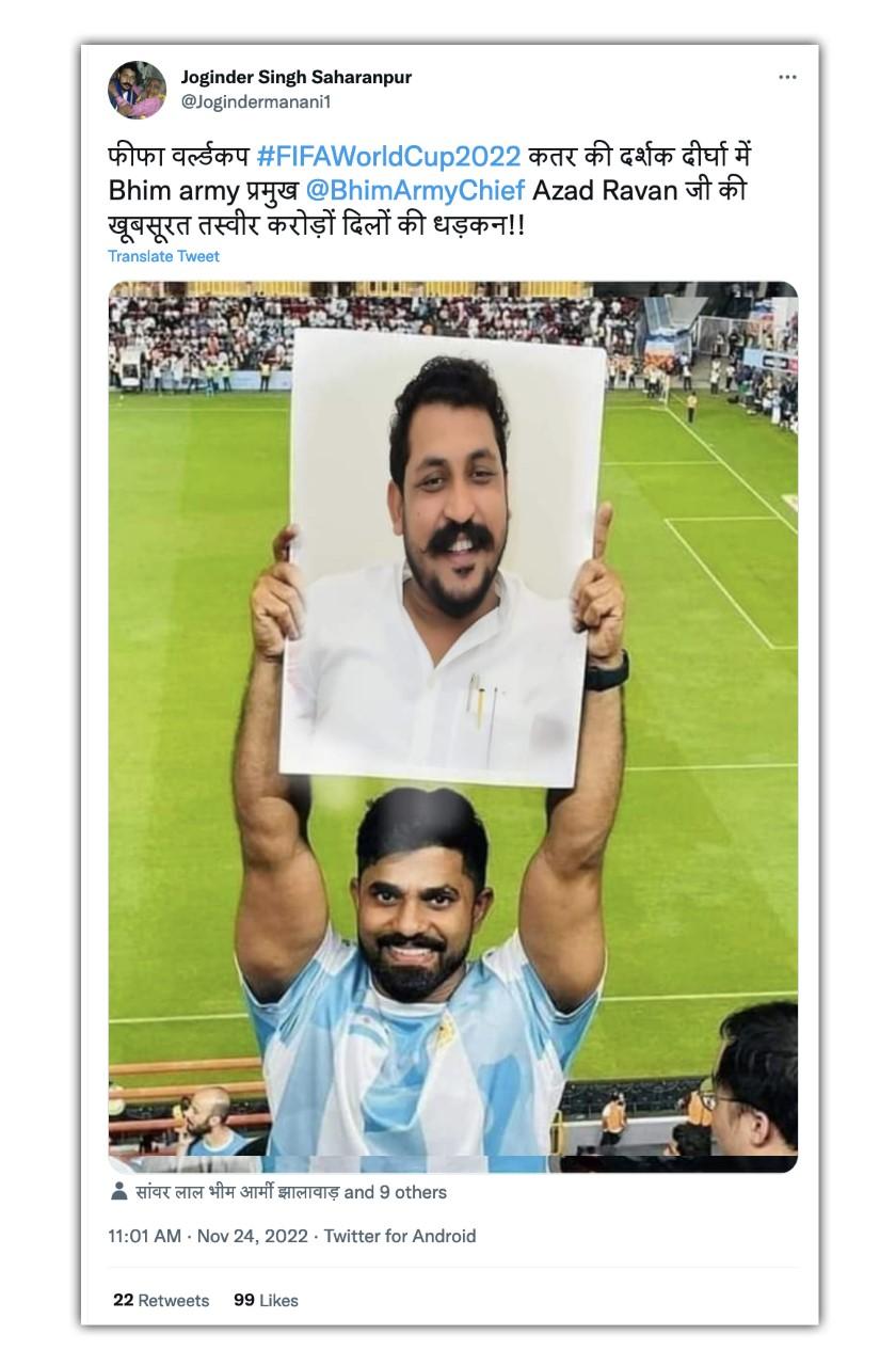 एक ट्विटर यूजर ने इस फोटो को पोस्ट करते हुए लिखा, "फीफा वर्ल्डकप #FIFAWorldCup2022 कतर की दर्शक दीर्घा में Bhim army प्रमुख @BhimArmyChief Azad Ravan जी की खूबसूरत तस्वीर करोड़ों दिलों की धड़कन!!"