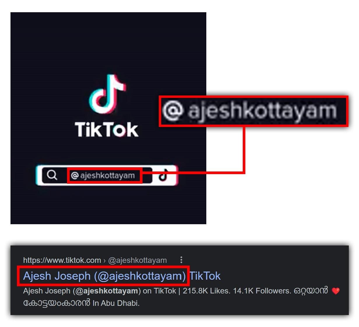 इसमें एक जगह टिकटॉक का लोगो और '@ajeshkottayam' भी लिखा दिखाई देता है. इस यूजरनेम को गूगल पर सर्च करने से हमें पता लगा कि वीडियो में दिख रहे शख्स का नाम अजेश जोसफ है जो कि मूल रूप से केरल के कोट्टायम का है, लेकिन वर्तमान में अबू धाबी में रहता है.