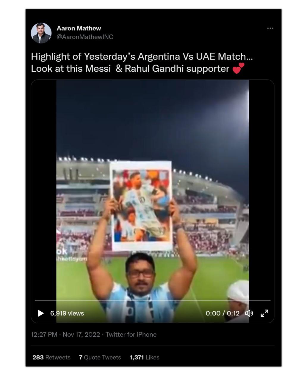 हमें सोशल मीडिया पर एक और वीडियो मिला जिसमें एक दूसरा लड़का स्टेडियम में अर्जेंटीना की जर्सी पहनकर राहुल गांधी वाला पोस्टर दिखा रहा है. इसे भी पिछले कई दिनों से 'फीफा विश्व कप' का वीडियो बताकर शेयर किया जा रहा है.