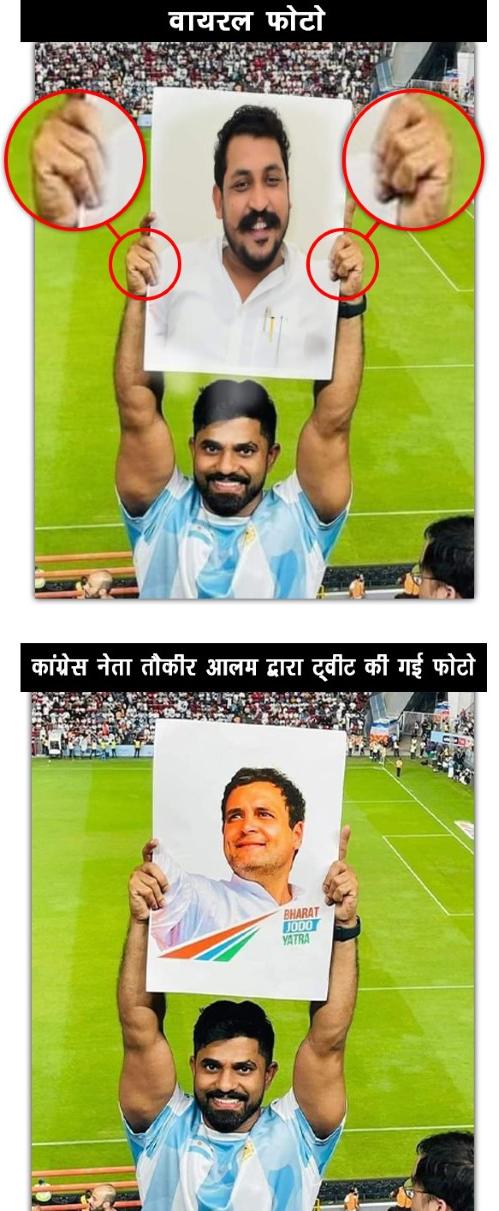 वायरल फोटो को रिवर्स सर्च करने पर हमें हूबहू ऐसी ही एक फोटो कांग्रेस नेता तौकीर आलम की 22 नवंबर की एक ट्विटर पोस्ट में मिली. इस फोटो में लड़के ने जो पोस्टर पकड़ा है, उसमें राहुल गांधी की तस्वीर है. इसे शेयर करते हुए तौकीर ने लिखा था, "फीफा वर्ल्डकप #FIFAWorldCup2022 कतर की दर्शक दीर्घा में #BharatJodoYatra की खूबसूरत तस्वीर".