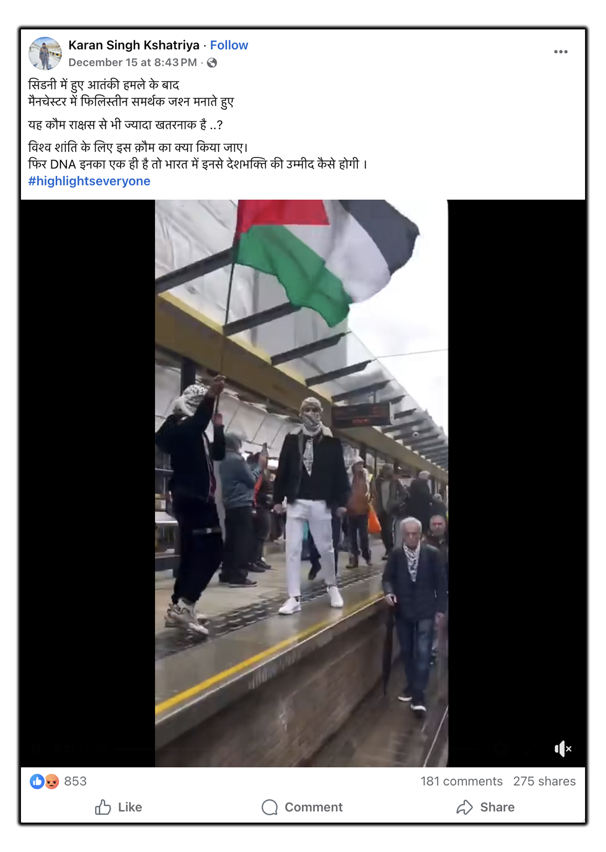 एक फेसबुक यूजर ने इस वीडियो को पोस्ट करते हुए लिखा, "सिडनी में हुए आतंकी हमले के बाद मैनचेस्टर में फिलिस्तीन समर्थक जश्न मनाते हुए यह कौम राक्षस से भी ज्यादा खतरनाक है ..? विश्व शांति के लिए इस क़ौम का क्या किया जाए. फिर DNA इनका एक ही है तो भारत में इनसे देशभक्ति की उम्मीद कैसे होगी."