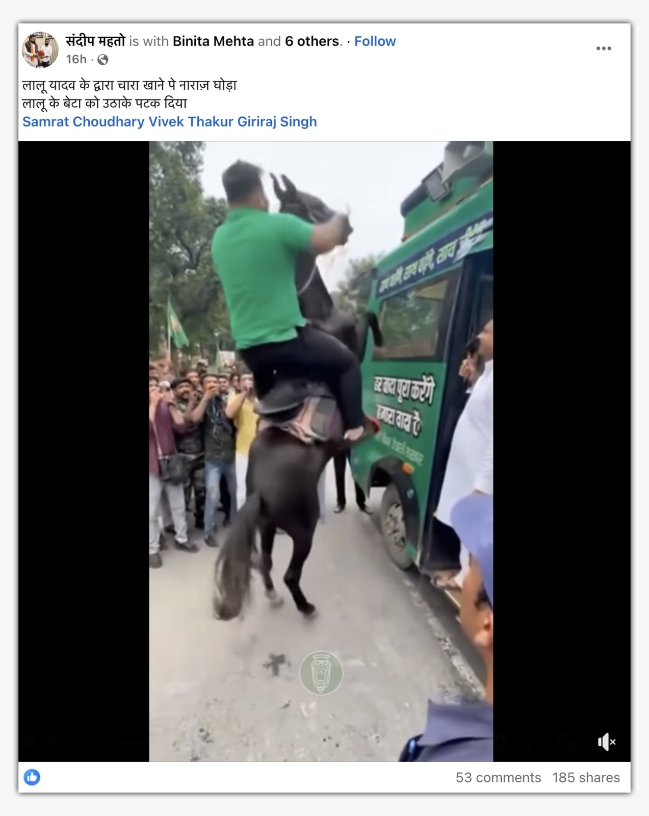मिसाल के तौर पर एक फेसबुक यूजर ने लिखा, “लालू यादव के द्वारा चारा खाने पे नाराज घोड़ा लालू के बेटा को उठाके पटक दिया.” इस पोस्ट का आर्काइव्ड वर्जन यहां देखा जा सकता है.