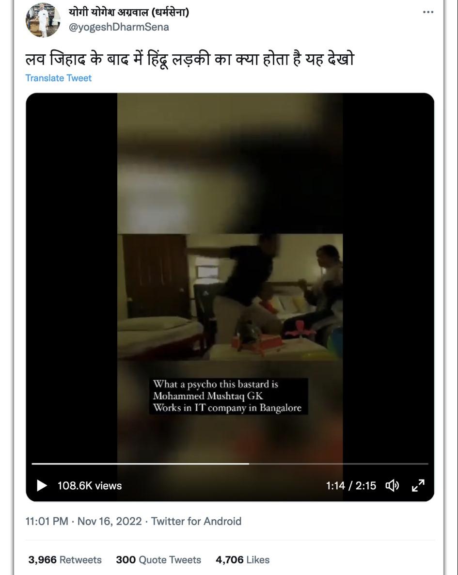 इन्हीं हैशटैग्स के साथ बच्चे के बर्थडे सेलीब्रेशन के दौरान एक महिला पर बेरहमी से हाथ उठाते पुरुष का एक वीडियो भी सोशल मीडिया पर शेयर किया जा रहा है. कई लोगों का कहना है कि ये लव जिहाद का मामला है, यानी वीडियो में दिख रही महिला हिंदू और पुरुष मुस्लिम है.