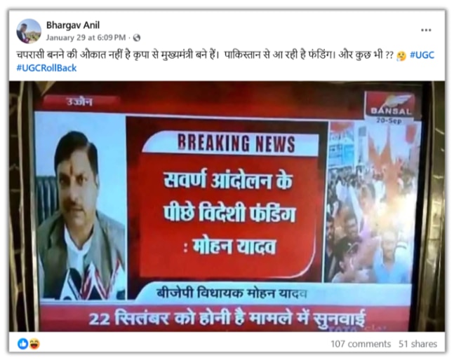 वायरल पोस्ट में एक न्यूज चैनल के ‘ब्रेकिंग न्यूज ग्राफिक’ की तस्वीर है. इसमें लिखा है- “सवर्ण आंदोलन के पीछे विदेशी फंडिंग: मोहन यादव”. अब सोशल मीडिया पर कुछ लोग इसे यूजीसी प्रदर्शनकारियों पर मोहन यादव की हालिया टिप्पणी बताकर उनकी आलोचना कर रहे हैं.