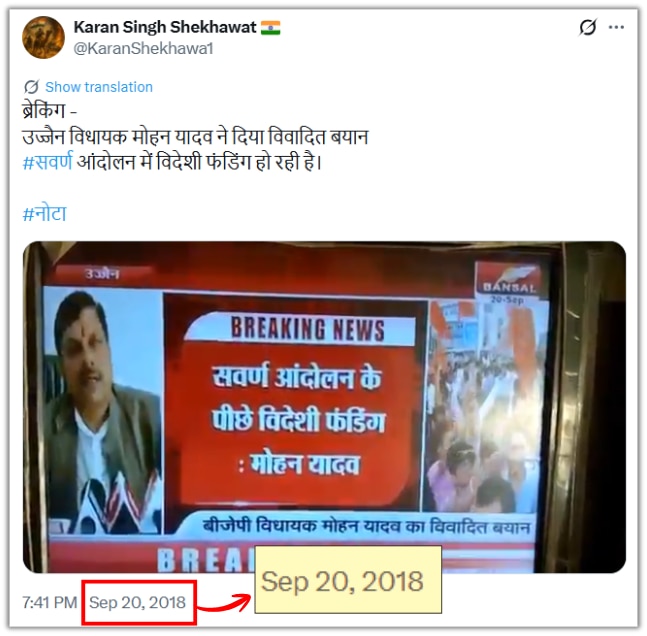 सितंबर 2018 में कई लोगों ने अलग-अलग चैनल्स की क्लिप्स शेयर की थी जिनमें मोहन यादव के इस बयान का जिक्र था. अभी वायरल हो रही तस्वीर भी इसी क्लिप का स्क्रीनशॉट है.