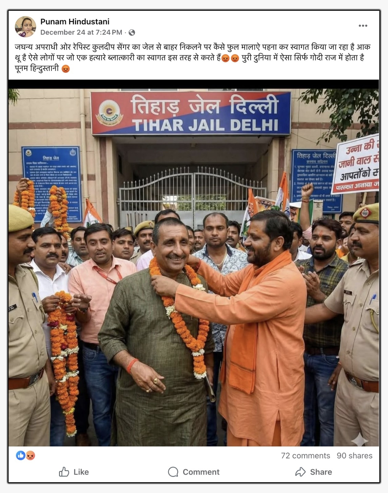 मिसाल के तौर पर फेसबुक पर एक व्यक्ति ने लिखा, “जघन्य अपराधी ओर रेपिस्ट कुलदीप सेंगर का जेल से बाहर निकलने पर कैसे फुल मालाऐ पहना कर स्वागत किया जा रहा है आक थू है ऐसे लोगों पर जो एक हत्यारे ब्लात्कारी का स्वागत इस तरह से करते हैं.”