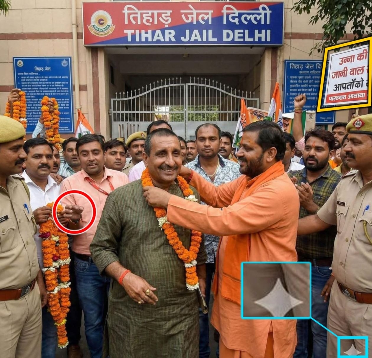इसी संदर्भ में सेंगर की एक तस्वीर सोशल मीडिया पर धड़ल्ले से वायरल हो रही है जिसमें वो फूल-माला पहने हुए तिहाड़ जेल के सामने अपने समर्थकों के साथ खड़े नजर आ रहे हैं. तस्वीर को शेयर करते हुए कई लोगों का कहना है कि जमानत मिलने पर जेल से बाहर के बाद सेंगर के समर्थकों ने फूल-मालाओं से उनका स्वागत किया.