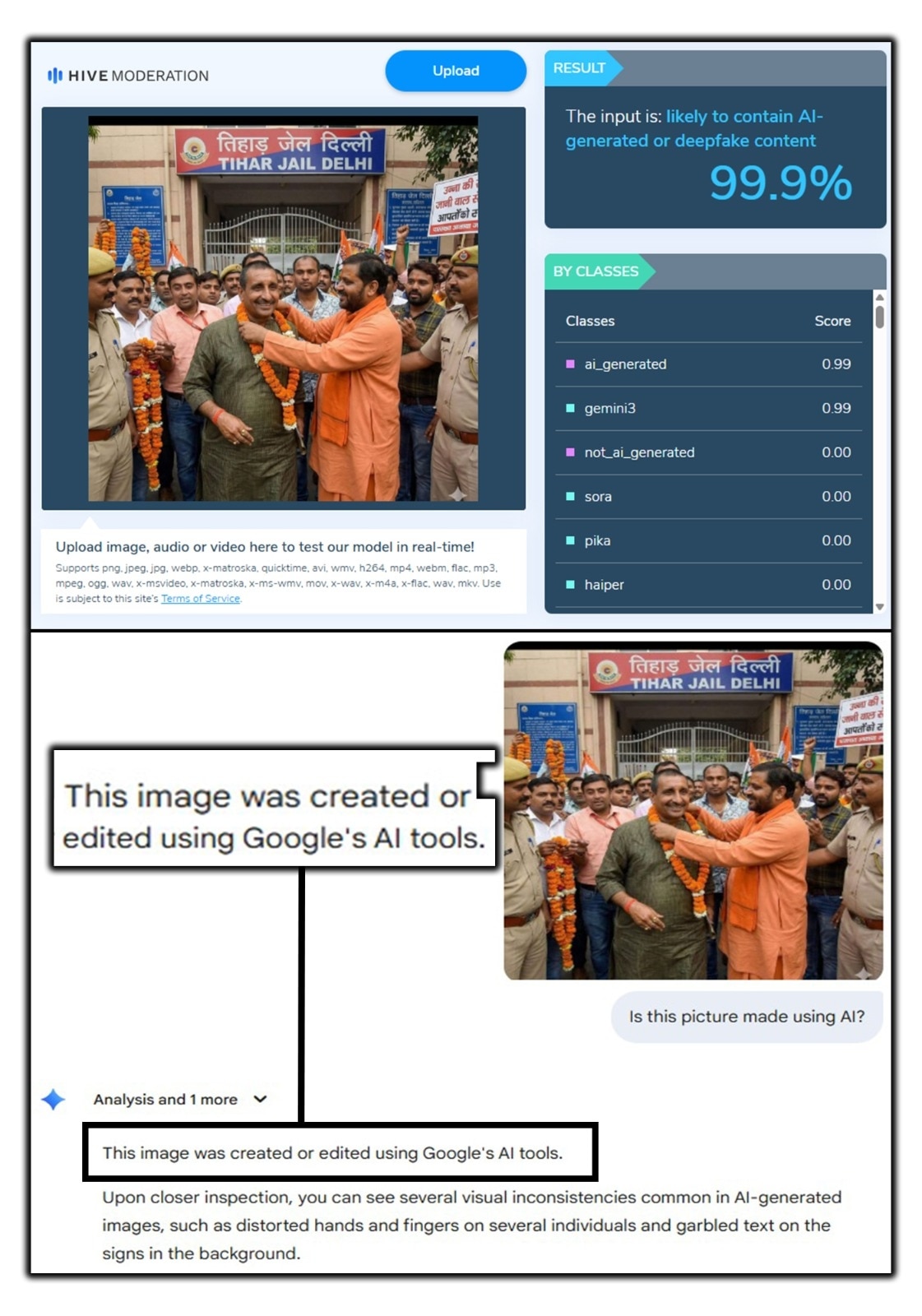 हमने AI डिटेक्शन टूल्स की मदद से इस तस्वीर को टेस्ट किया. Hive Moderation और Sightengine दोनों ही टूल्स ने इस तस्वीर के AI से बने होने की 99 फीसदी संभावना बताई. Gemini ने भी बताया कि इस तस्वीर को गूगल के AI टूल से बनाया या एडिट किया गया है. सेंगर के वकील ने भी इस तस्वीर को फर्जी बताया है.