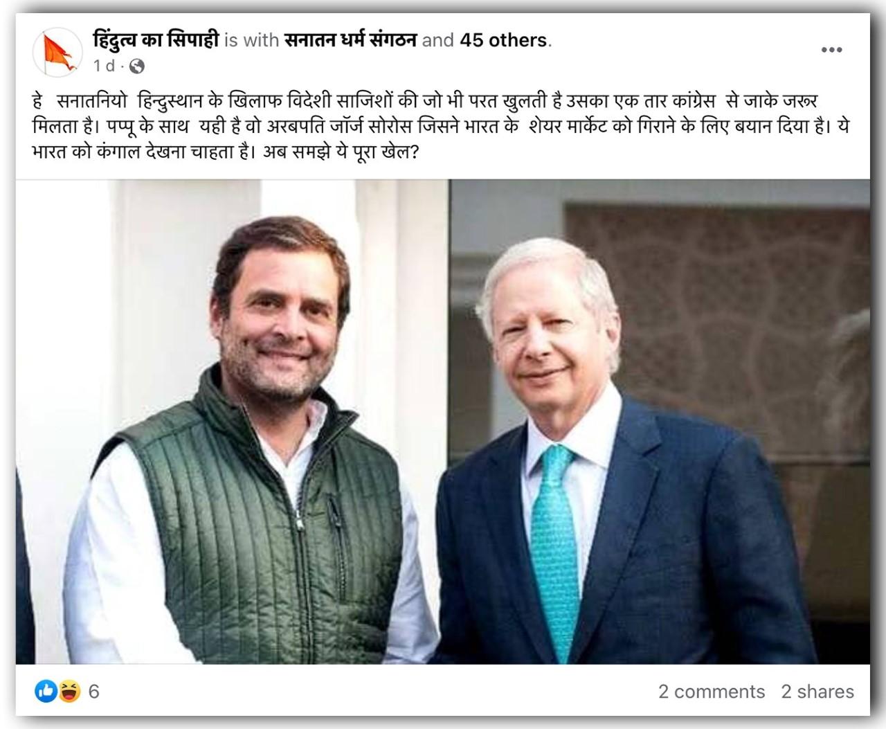 एक फेसबुक यूजर ने इस तस्वीर को शेयर करते हुए लिखा, “हे सनातनियो हिन्दुस्तान के खिलाफ विदेशी साजिशों की जो भी परत खुलती है उसका एक तार कांग्रेस से जाकर जरूर मिलता है. पप्पू के साथ यही है वो अरबपति जॉर्ज सोरोस जिसने भारत के शेयर मार्केट को गिराने के लिए बयान दिया है. ये भारत को कंगाल देखना चाहता है. अब समझे ये पूरा खेल?.”