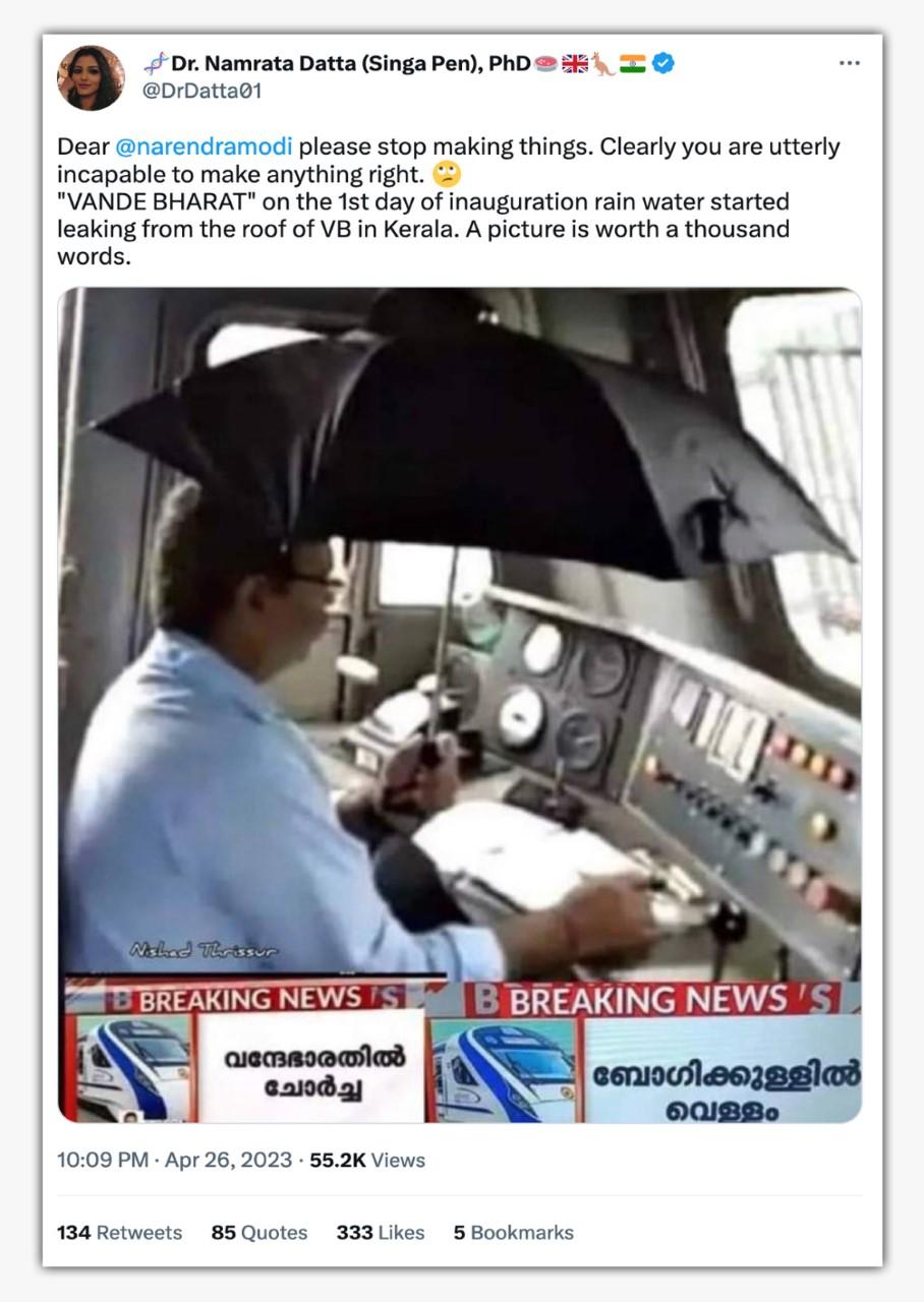 हाथ में छतरी पकड़कर बैठे लोको पायलट की एक चौंकाने वाली तस्वीर इन दिनों सोशल मीडिया पर खूब वायरल है. कई लोग ऐसा कह रहे हैं कि ये केरल की पहली वंदे भारत एक्स्प्रेस के ड्राइवर की तस्वीर है, जिसे ट्रेन की छत से टपक रहे पानी की वजह से छाते का इस्तेमाल करना पड़ा. ऐसे कुछ पोस्ट्स का आर्काइव्ड वर्जन यहां और यहां देखा जा सकता है.