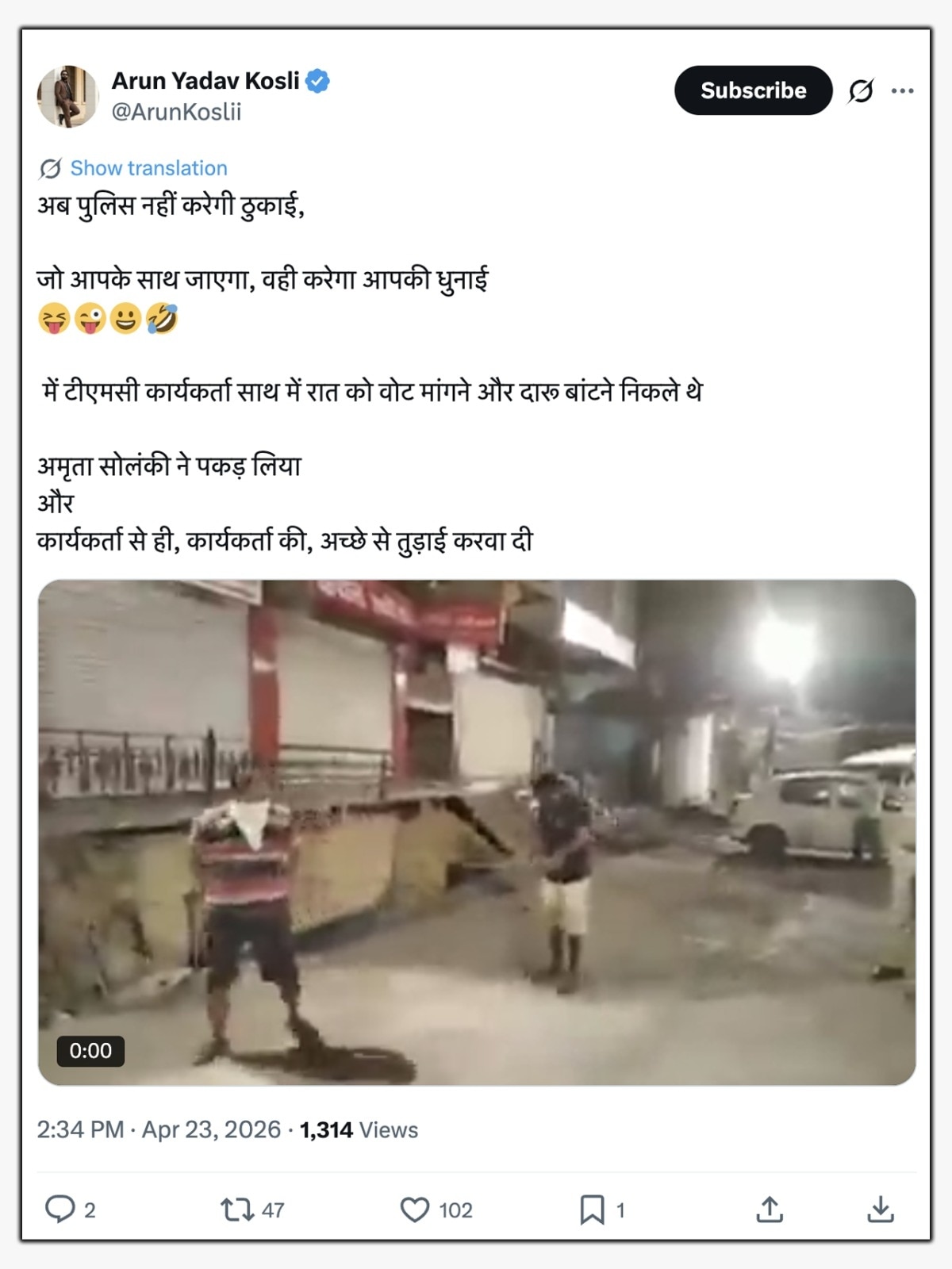 वीडियो शेयर करते हुए एक्स पर एक व्यक्ति ने लिखा, “अब पुलिस नहीं करेगी ठुकाई, जो आपके साथ जाएगा, वही करेगा आपकी धुनाई. टीएमसी कार्यकर्ता साथ में रात को वोट मांगने और दारू बांटने निकले थे. अमृता सोलंकी ने पकड़ लिया और कार्यकर्ता से ही, कार्यकर्ता की, अच्छे से तुड़ाई करवा दी”