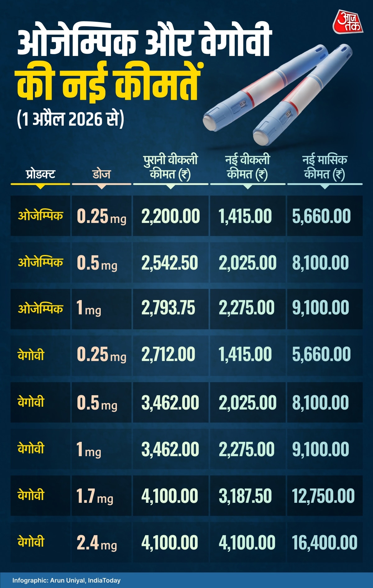 कंपनी द्वारा जारी नई रेट लिस्ट के मुताबिक, ओजेम्पिक और वेगोवी के 0.25mg वाले शुरुआती डोज की साप्ताहिक कीमत अब 1415 रुपये होगी जो पहले 2,200 रुपये थी. इसका मतलब है कि एक महीने का खर्च अब लगभग 5660 रुपये (टैक्स सहित) आएगा.