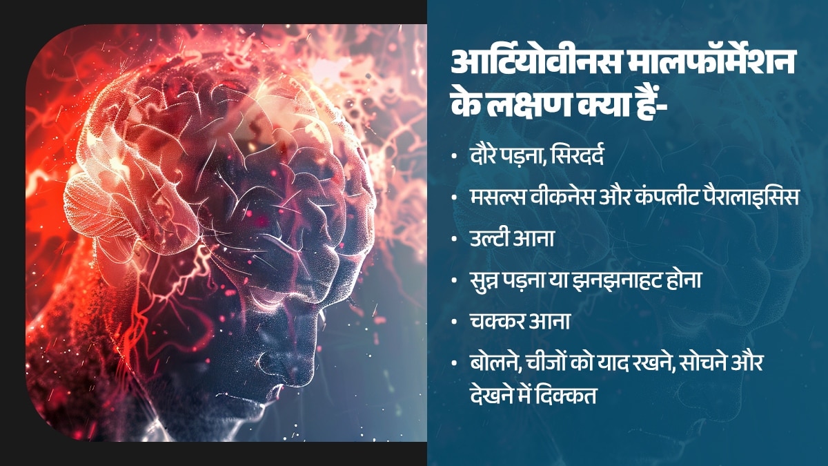 डॉ. जयेश सरधारा ने बताया कि आर्टियोवीनस मालफॉर्मेशन की समस्या ब्रेन के किसी भी हिस्से में हो सकती है. अगर आर्टियोवीनस मालफॉर्मेशन ब्रेन के पेरीफेरल सरफेस पर होता है जो उससे मरीज को दौरे पड़ने की समस्या का सामना करना पड़ता है. इसके अलावा कुछ अन्य समस्याएं हो सकती हैं. जैसे,