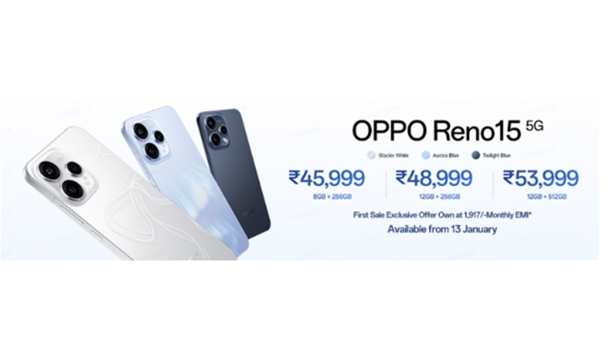 OPPO Reno15 5G की शुरुआती कीमत ₹45,999 से शुरू होती है और यह देशभर में प्रमुख ऑफलाइन रिटेल स्टोर्स, OPPO e-store, अमेज़न और फ्लिपकार्ट पर उपलब्ध है।
