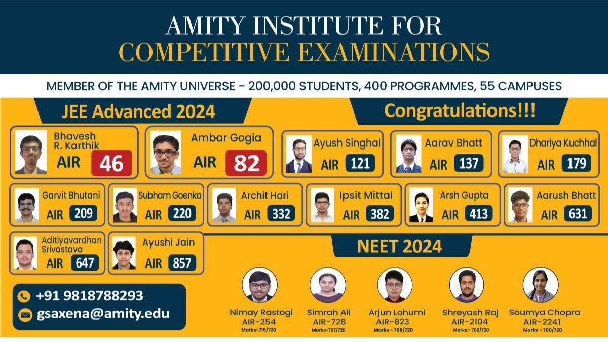 जेईई एडवांस 2024 में एमिटी की कोचिंग (एआईसीई) के छात्रों का असाधारण प्रदर्शन: