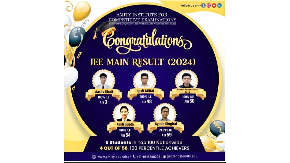 जेईई मेन 2024 में, एमिटी इंस्टीट्यूट फॉर कॉम्पिटिटिव एग्जामिनेशंस (एआईसीई) के छात्रों ने सर्वश्रेष्ठ प्रदर्शन किया है, जिसके 4 छात्रों ने प्रतिष्ठित 100 परसेंटाइल हासिल किया है। आरव भट्ट (AIR 3), इप्सित मित्तल(AIR 48), भावेश रामकृष्णन कार्तिक (AIR 50), अर्श गुप्ता(AIR 54), ने अपना नाम, प्रतिष्ठित 100 परसेंटाइल प्राप्त करने वाले छात्रों में, दर्ज कराया है। यह उल्लेखनीय उपलब्धि न केवल एआईसीई में प्रदान की जाने वाली शिक्षा की क्षमता को रेखांकित करती है, बल्कि सम्पूर्ण भारत वर्ष में एक अग्रणी कोचिंग संस्थान के रूप में इसकी स्थिति की भी पुष्टि करती है।