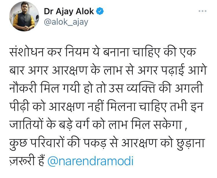 जेडीयू नेता अजय आलोक ने आरक्षण से जुड़ी खबर को ट्वीट करते हुए लिखा है, 'संशोधन कर नियम ये बनाना चाहिए कि एक बार अगर आरक्षण के लाभ से पढ़ाई और आगे नौकरी मिल गयी हो तो उस व्यक्ति की अगली पीढ़ी को आरक्षण नहीं मिलना चाहिए तभी इन जातियों के बड़े वर्ग को लाभ मिल सकेगा , कुछ परिवारों की पकड़ से आरक्षण को छुड़ाना जरूरी हैं.' अजय आलोक ने अपने इस ट्वीट में प्रधानमंत्री नरेंद्र मोदी को टैग किया है.