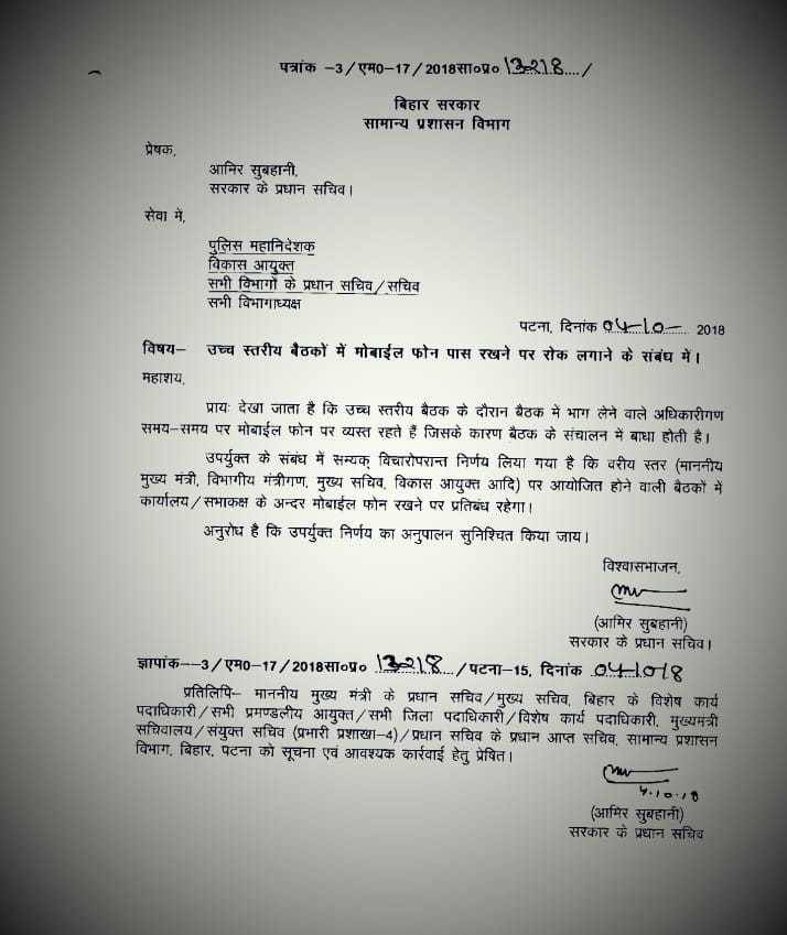 अधिकारियों के इस हरकत से नीतीश कुमार इतने नाराज हुए कि शाम होते-होते सरकार के प्रधान सचिव आमिर सुभानी की तरफ से एक सरकारी आदेश जारी किया गया जिसमें कहा गया कि आइंदा से ऐसी कोई भी बैठक जिसकी अध्यक्षता मुख्यमंत्री, विभाग के मंत्री, मुख्य सचिव या विकास आयुक्त करेंगे ऐसी बैठकों में अधिकारियों के मोबाइल फोन लेकर जाने पर पाबंदी लगाई गई है.
