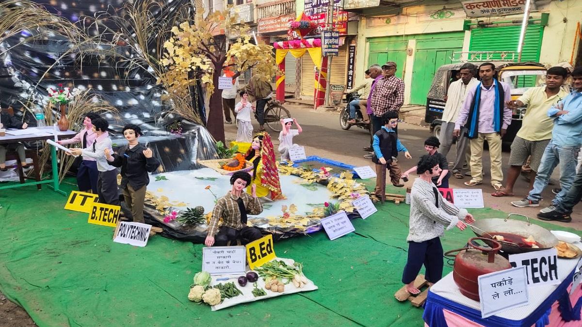 बेरोजगारी की यह झांकी सोशल मीडिया पर भी वायरल है. शहर के नवादा चौक पर आदर्श कला मंदिर की ओर से यह झांकी बनाई गई थी. झांकी में बेरोजगारी को केन्द्रित करते हुए मूर्तियां बनाई गई थी जिसमें दिखाया गया है कि बी.टेक, बीएड, MBA कर चुके नौजवानों में से कोई समोसा तल रहा है, कोई सब्जी बेच रहा है.