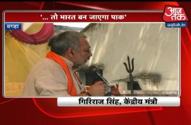 केंद्रीय मंत्री गिरिराज सिंह ने बुधवार को कहा कि अगर भारत ने अपनी जनसंख्या नीति को नहीं बदला और हर धर्म के लिए दो बच्चों की नीति को लागू नहीं किया तो बेटियों सुरक्षित नहीं रहेंगी और पाकिस्तान की तरह उन्हें पर्दे में रखना पड़ेगा. बिहार के नवादा से बीजेपी सांसद चंपारण में एक सांस्कृतिक यात्रा में बोल रहे थे.