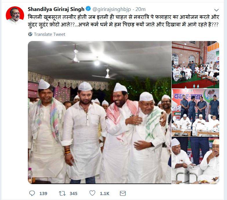 ईद के त्योहार से पहले हर जगह राजनीतिक इफ्तार पार्टी का दौर चल रहा है. नेता अपने समर्थकों और साथियों के साथ मोहब्बत का पैगाम दे रहे हैं. इसी बीच बिहार में हुई इफ्तार पार्टी पर अब राजनीतिक लड़ाई भी सामने आई है. केंद्रीय मंत्री और भारतीय जनता पार्टी के नेता गिरिराज सिंह ने मंगलवार सुबह ट्वीट कर इफ्तार पार्टी पर सवाल उठाए. गिरिराज ने लिखा कि कितना अच्छा होता कि इतनी ही चाहत से हम नवरात्रि पर फलाहार का आयोजन करते.
