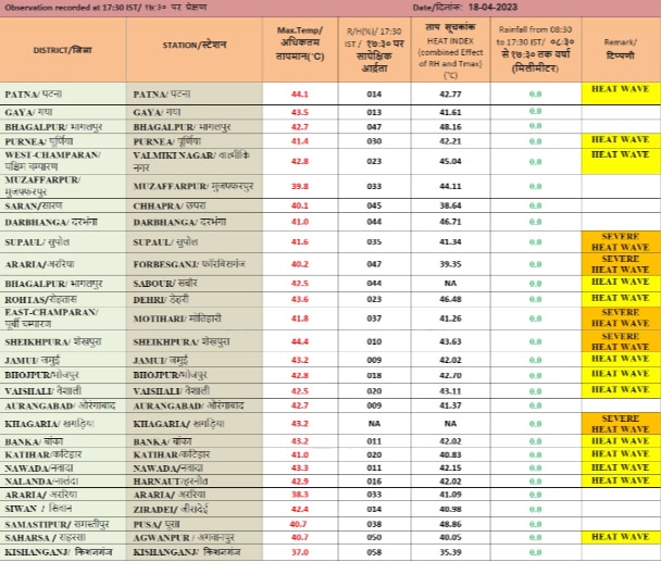 IMD के मुताबिक, पटना में 18 अप्रैल को अधिकतम तापमान 44.1 डिग्री सेल्सियस रिकॉर्ड किया गया. जबकि शेखपुरा जिले में 44.4 डिग्री सेल्सियस पारा दर्ज किया गया. इसके अलावा बिहार के 13 जिलों के हीटवेव का असर देखने को मिला जबकि 5 जिलों के सीवियर हीटवेव की स्थिति रही.