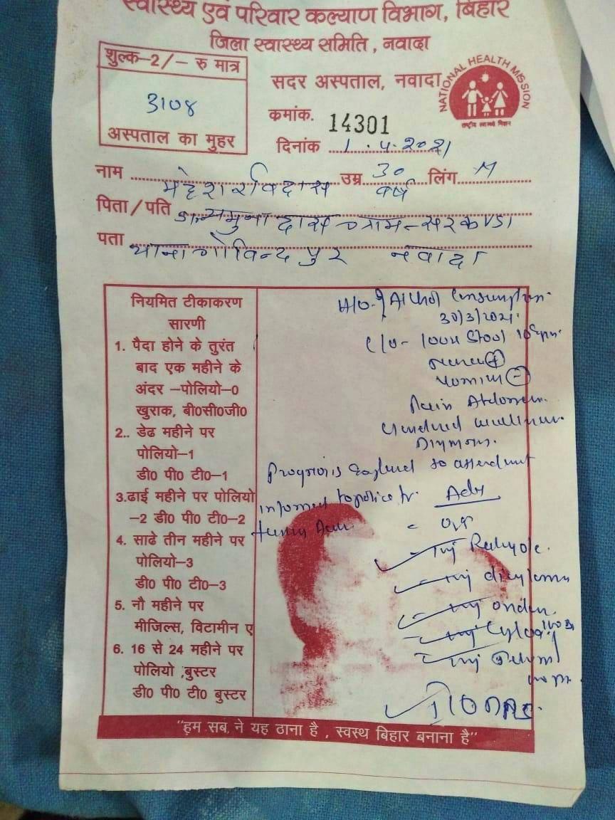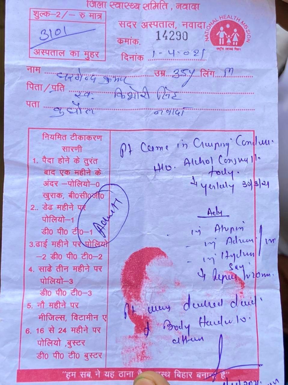 इस बीच नवादा जिले के सदर अस्पताल की एक पर्ची सामने आई है, जिस पर मरीज का नाम धर्मेंद्र कुमार लिखा हुआ है और 1 अप्रैल 2021 की तारीख दर्ज है. धर्मेंद्र कुमार की गुरुवार को इलाज के दौरान सदर अस्पताल में मौत हो गई. इस सरकारी पर्ची में सदर अस्पताल के डॉक्टर ने साफ-साफ लिखा है Alcohol consumption यानी कि धर्मेंद्र कुमार ने शराब का सेवन किया था.