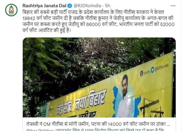 आरजेडी ने ट्वीट करते हुए कहा कि बिहार की सबसे बड़ी पार्टी आरजेडी के प्रदेश कार्यालय के लिए नीतीश सरकार ने केवल 19842 वर्ग फीट जमीन दी है जबकि नीतीश कुमार ने जेडीयू कार्यालय के अगल-बगल की जमीन पर कब्जा करते हुए जेडीयू को 66000 वर्ग फीट, भारतीय जनता पार्टी को 52000 वर्ग फीट आवंटित की हुई है.