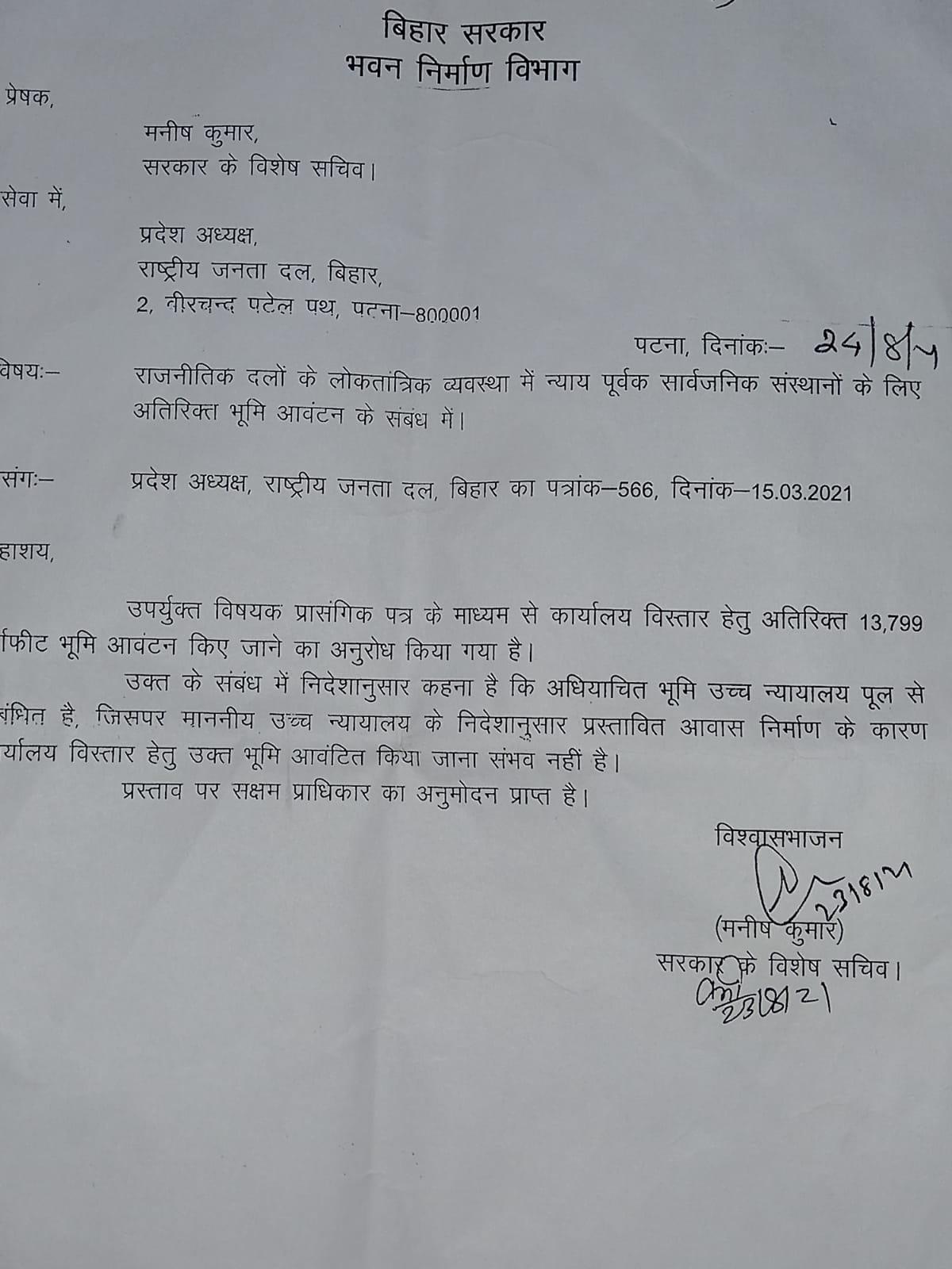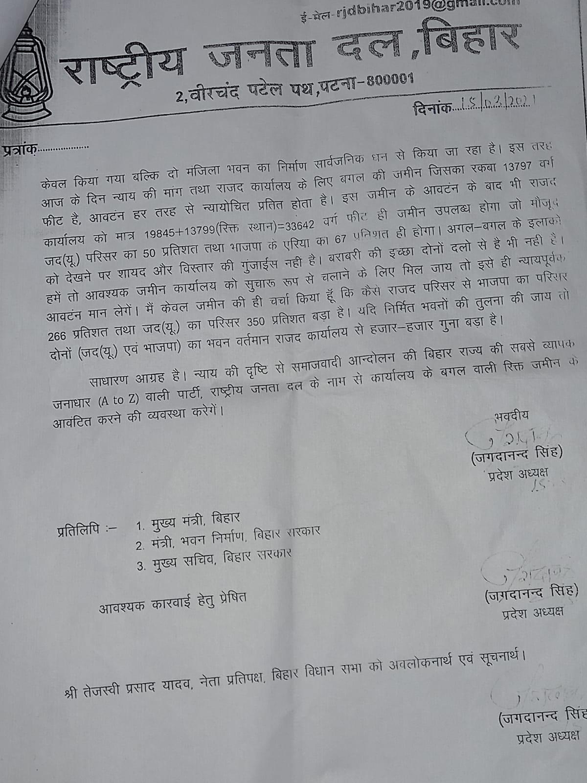 हालांकि आरजेडी ने अब यह पत्र सार्वजिनक करते हुए दावा किया है कि आरजेडी दफ्तर के परिसर से बीजेपी दफ्तर 266 फीसदी और जेडीयू दफ्तर 350 फीसदी बड़ा है.