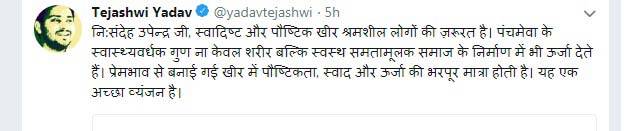 तेजस्वी ने आगे लिखा कि पंचमेवा के स्वास्थ्यवर्धक गुण न केवल शरीर बल्कि स्वस्थ समतामूलक समाज के निर्माण में भी ऊर्जा देते हैं. तेजस्वी ने कहा कि प्रेम भाव से बनाई गई खीर में पौष्टिकता, स्वाद और ऊर्जा की भरपूर मात्रा होती है और यह एक अच्छा व्यंजन है.