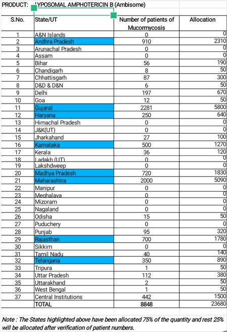 इसी दौरान शनिवार को सभी राज्यों/केंद्र शासित प्रदेशों को एम्फोटेरिसिन-बी की कुल 23,680 अतिरिक्त वायल आवंटित किये गए हैं. रसायन एवं उर्वरक मंत्री (Chemicals and Fertilizers Minister) डीवी सदानंद गौडा (DV Sadananda Gowda) ने यह जानकारी दी.