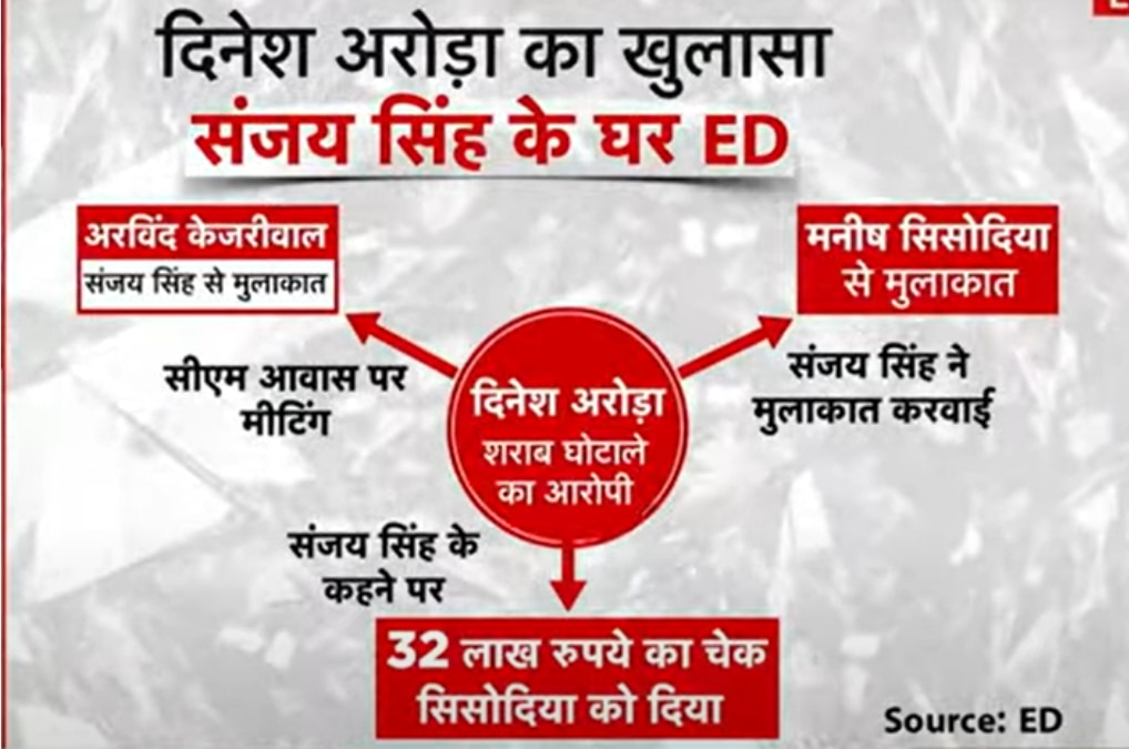 आरोपी दिनेश अरोड़ा को केस में मुख्य कड़ी माना जा रहा है. ईडी ने अपनी चार्जशीट में आरोप लगाया था कि दिनेश अरोड़ा ने दिल्ली के मुख्यमंत्री अरविंद केजरीवाल से उनके आवास पर मुलाकात की थी. इस बैठक में संजय सिंह भी मौजूद थे. दिनेश अरोड़ा ने पूछताछ के दौरान बताया था कि वह सबसे पहले एक कार्यक्रम में संजय सिंह से मिला था. इसके बाद वह मनीष सिसोदिया के संपर्क में आया. सूत्रों का कहना है, यह दिल्ली चुनाव से पहले AAP नेता द्वारा आयोजित एक फंड जुटाने का कार्यक्रम था.