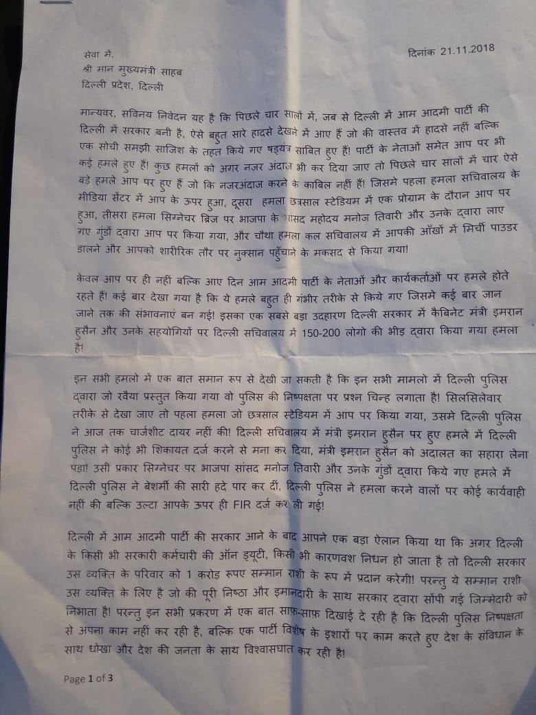 पत्र में लिखा गया है कि 'पिछले चार सालों में जब से दिल्ली में आम आदमी पार्टी की दिल्ली में सरकार बनी है, ऐसे बहुत सारे हादसे देखने में आए हैं जो वास्तव में हादसे नहीं बल्कि एक सोची समझी साजिश के तहत किए गए षड्यंत्र साबित हुए हैं. पार्टी के नेताओं समेत आप पर भी कई हमले हुए हैं. कुछ हमलों को अगर नजरअंदाज भी कर दिया जाए तो पिछले चार साल में चार ऐसे बड़े हमले आप पर हुए हैं जो कि नजरअंदाज करने के काबिल नहीं हैं. इसमें पहला हमला सचिवालय के मीडिया सेंटर का है. दूसरा हमला छत्रसाल स्टेडियम में एक प्रोग्राम के दौरान हुआ. तीसरा हमला सिग्नेचर ब्रिज पर बीजेपी के सांसद मनोज तिवारी और उनके लाए गए गुंडों ने किया गया और चौथा हमला मंगलवार को सचिवालय में आपकी आंखों में मिर्ची पाउडर डालने और आपको शारीरिक तौर पर नुकसान पहुंचाने के मकसद से किया गया.'
