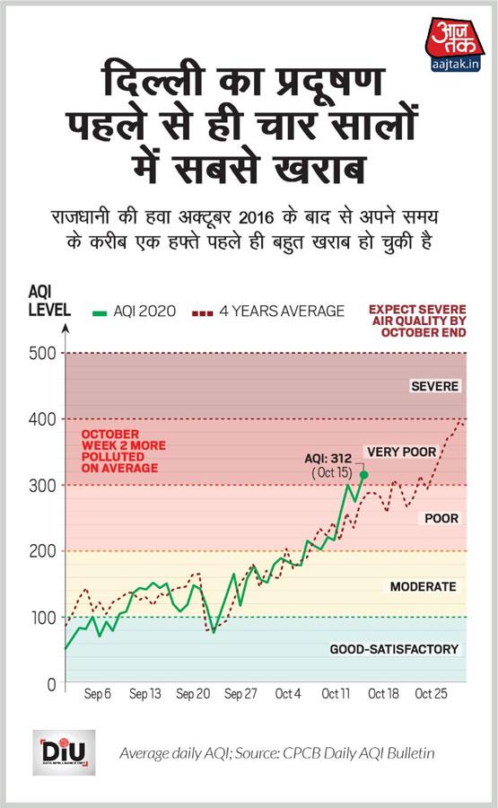 एक हफ्ते में यह दूसरी बार है जब AQI ने 300 का आंकड़ा पार किया है. इसके अलावा, पिछले चार सालों में ये पहली बार है कि अक्टूबर के मध्य तक दिल्ली में हवा की गुणवत्ता बहुत खराब हो गई.