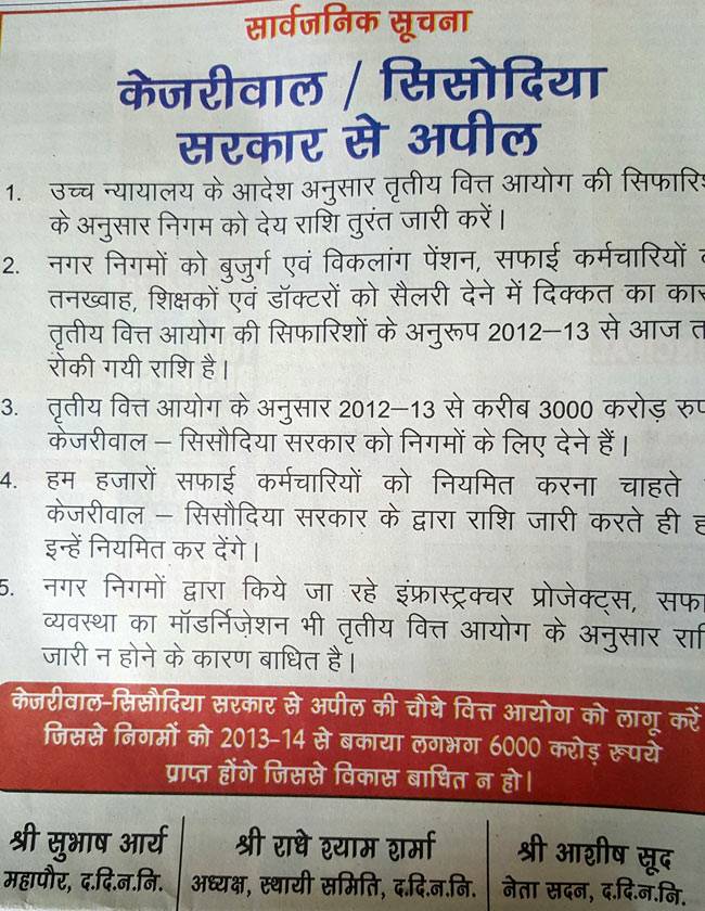 साउथ एमसीडी के मेयर ने विज्ञापन में कहा कि केजरीवाल-सिसोदिया सरकार ने तीसरे वित्त आयोग की सिफारिशों के बावजूद निगमों का करीब 3000 करोड़ रुपये फंड रोक रखा है. उन्होंने कहा, 'सरकार से अपील है कि वह चौथा वेतन आयोग लागू करे, जिससे निगमों को 6000 करोड़ रुपये मिलेंगे. जिससे विकास जारी रहे.'