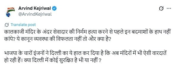 पूर्व सीएम अरविंद केजरीवाल ने एक एक्स पोस्ट में कहा, "कालकाजी मंदिर के अंदर सेवादार की निर्मम हत्या करने से पहले इन बदमाशों के हाथ नहीं कांपे? ये कानून व्यवस्था की विफलता नहीं तो और क्या है? भाजपा के चारों इंजनों ने दिल्ली का ये हाल कर दिया है कि अब मंदिरों में भी ऐसी वारदातें हो रही हैं. क्या दिल्ली में कोई सुरक्षित है भी या नहीं?"