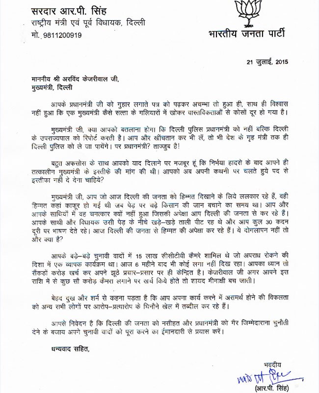 इन सब के बीच बीजेपी के राष्ट्रीय मंत्री और पूर्व विधायक सरदार आरपी सिंह ने मुख्यमंत्री केजरीवाल को चिट्ठी भी लिखी है. चिट्ठी में उन्होंने सीएम को लिखा है कि दिल्ली पुलिस प्रधानमंत्री को नहीं बल्कि उपराज्यपाल को रिपोर्ट करती है. उन्होंने आगे लिखा है, 'मुख्यमंत्री जी आप जो आप जो दिल्ली की जनता को हिम्मत दिखाने के लिए ललकार रहे हैं, वही हिम्मत कहां काफूर हो गई थी, जब पेड़ पर चढ़े किसान की जान बचाने का समय था.'