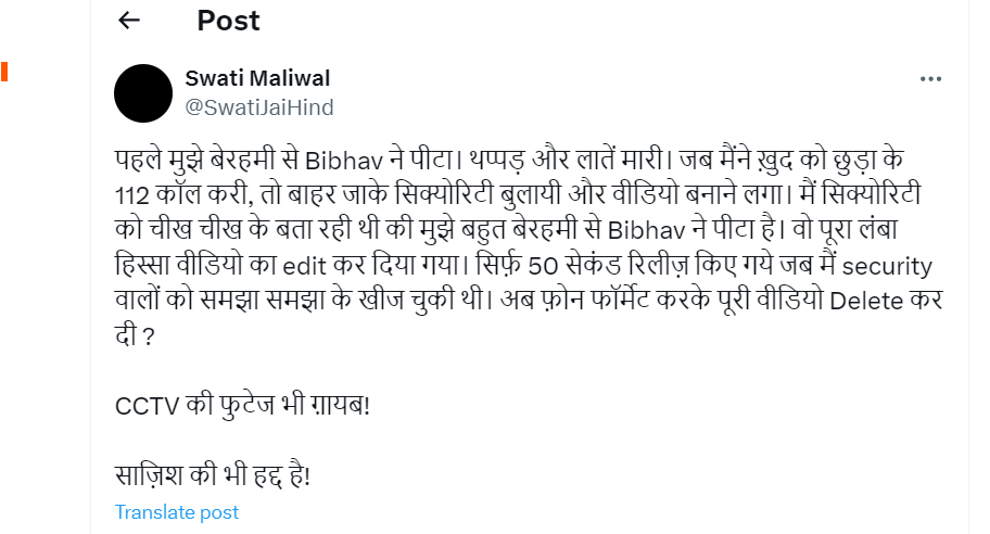कोर्ट में हुई बहस पर स्वाति मालीवाल ने एक्स पर पोस्ट करते हुए , 'पहले मुझे बेरहमी से Bibhav ने पीटा. थप्पड़ और लातें मारी. जब मैंने ख़ुद को छुड़ा के 112 कॉल करी, तो बाहर जाकर सिक्योरिटी बुलाई और वीडियो बनाने लगा. मैं सिक्योरिटी को चीख-चीख के बता रही थी की मुझे बहुत बेरहमी से Bibhav ने पीटा है. वो पूरा लंबा हिस्सा वीडियो का edit कर दिया गया. सिर्फ 50 सेकंड रिलीज़ किए गये जब मैं सिक्योरिटी वालों को समझा समझा के खीज चुकी थी. अब फ़ोन फॉर्मेट करके पूरी वीडियो Delete कर दी ? CCTV की फुटेज भी ग़ायब! साज़िश की भी हद्द है!'